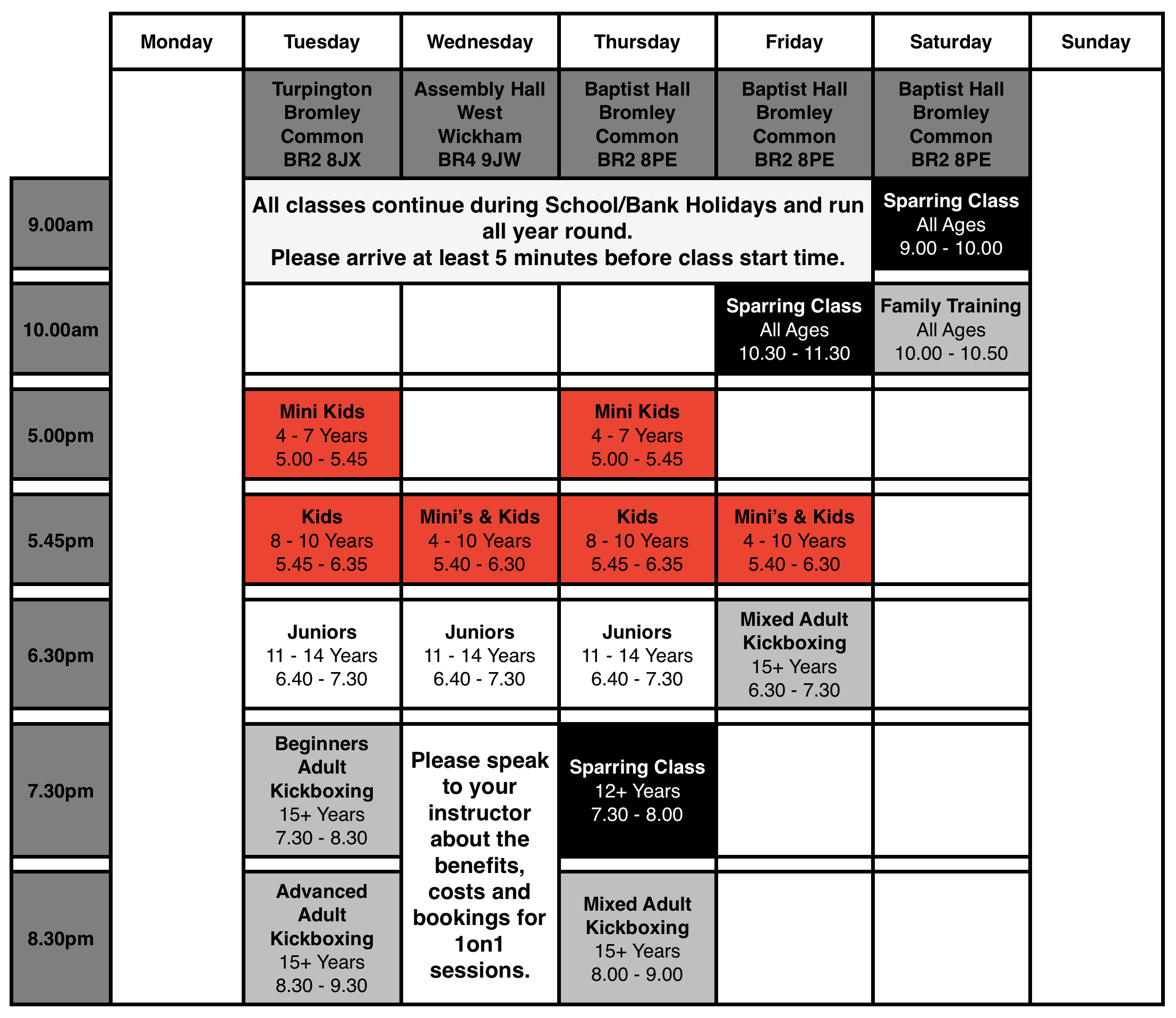 We will be returning to our regular timetable as of Friday 1st September. There have been some slight alterations to the timetable including the introduction of an open sparring session on Thursday and a Friday Morning class open to all ages and abilities. Please note that some students are due to move up a class. If you unsure please see the page below as reference or speak to your instructor.